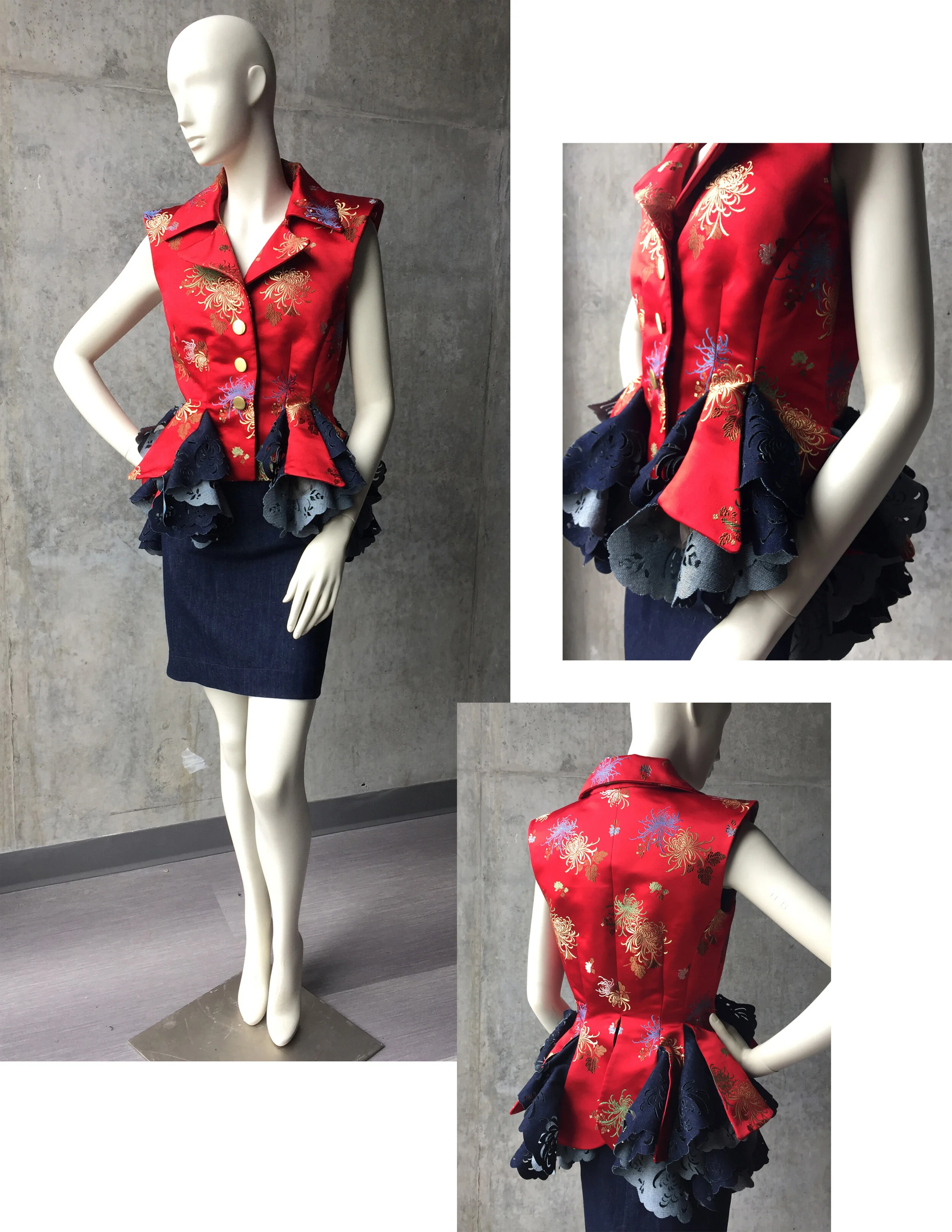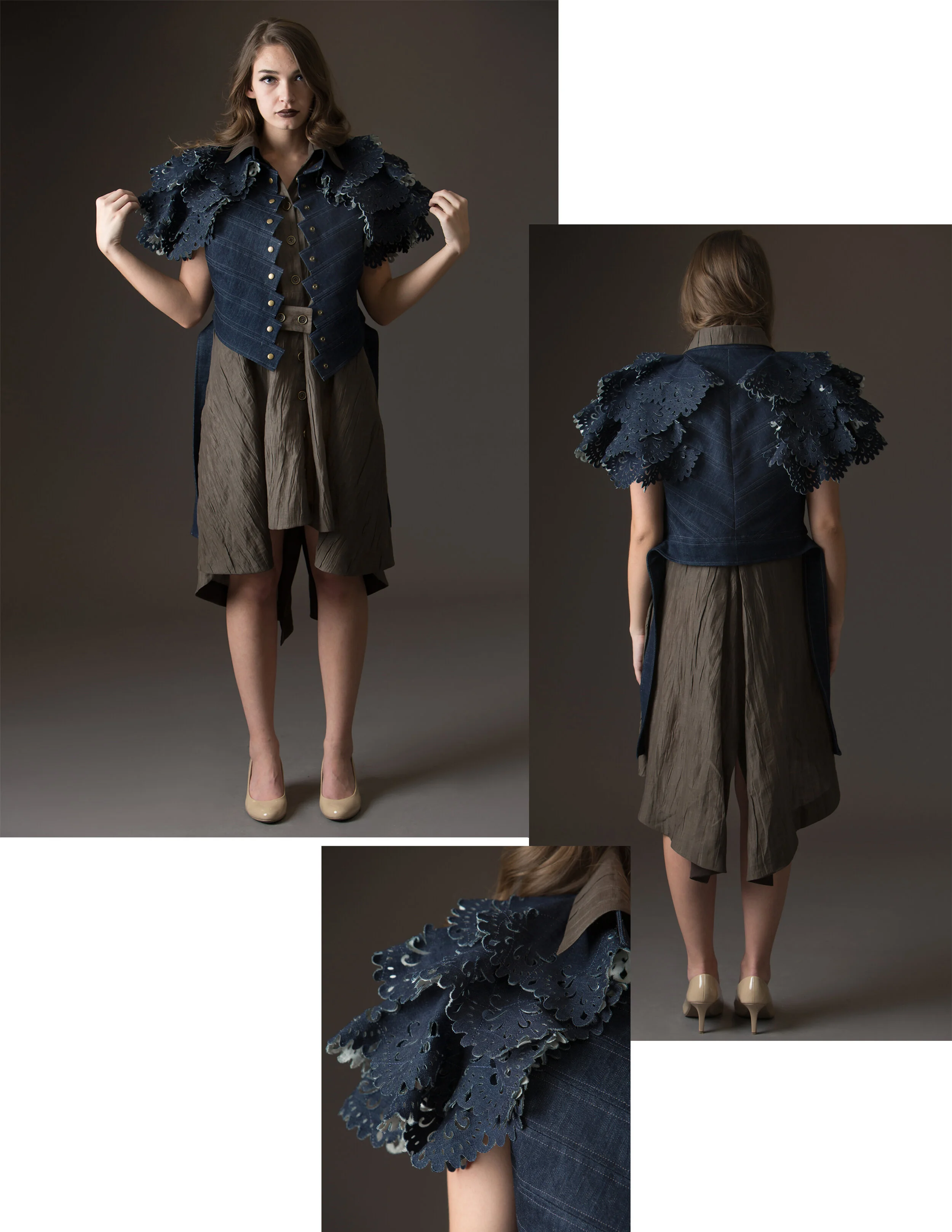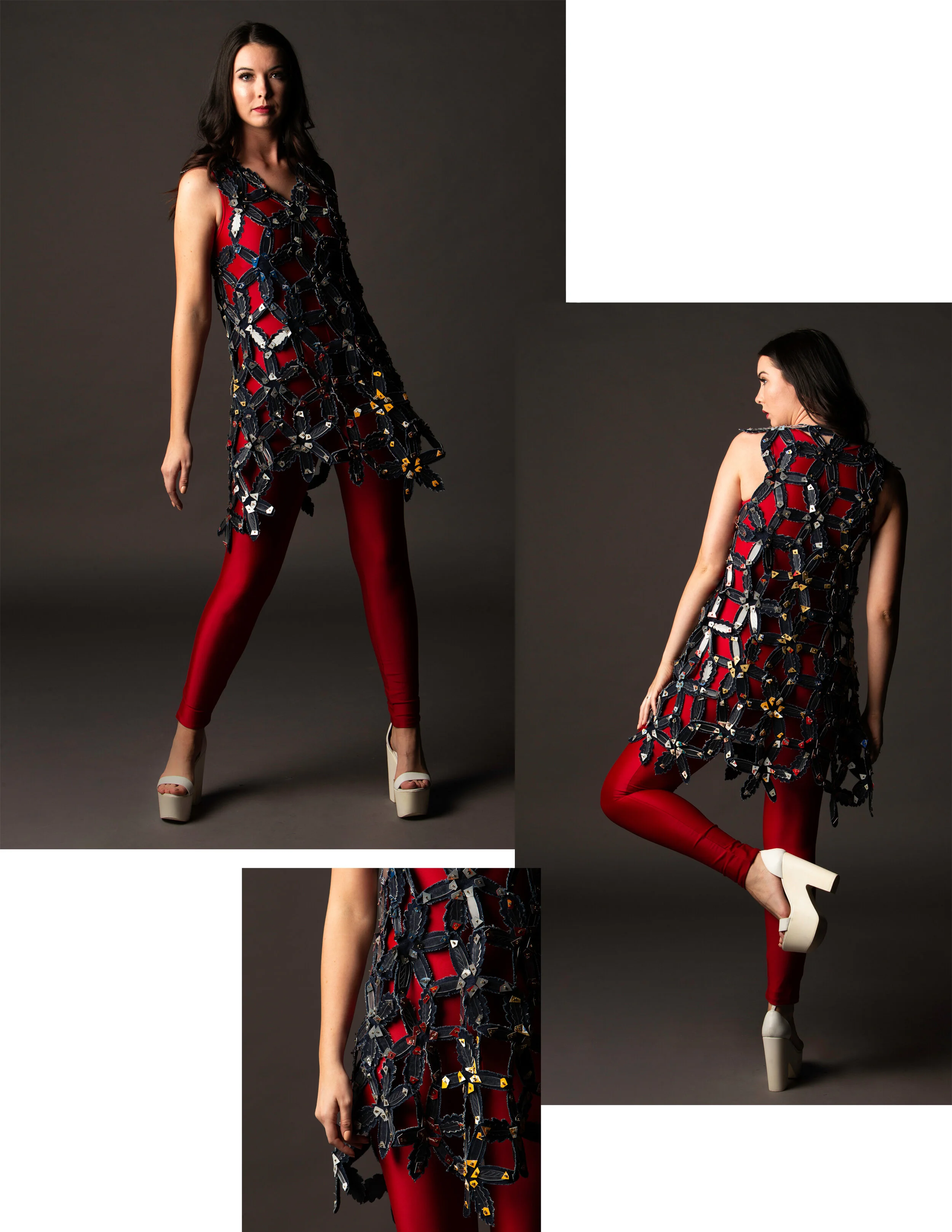 The acquisition of unusual waste materials inspired this ensemble. Not wanting the beautiful materials to be tossed in the trash, they were re-assembled and combined with 3D print digital technology into a new, useable textile.